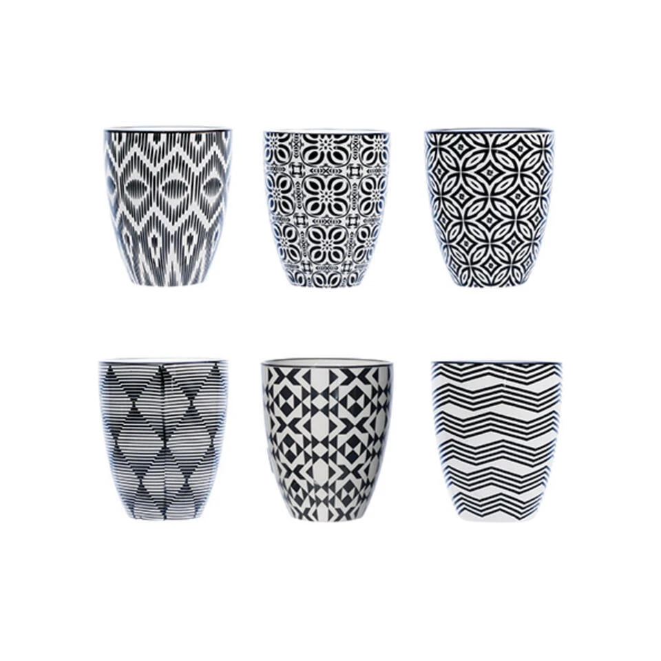 De Cosy & Trendy Nikko Black bekers zonder oor in wit porselein hebben een assortiment van zes verschillende zwarte geometrische patronen, die allemaal perfect samen passen op tafel.
