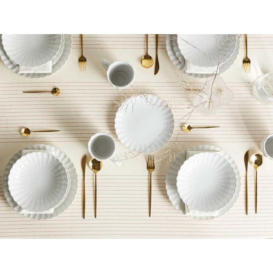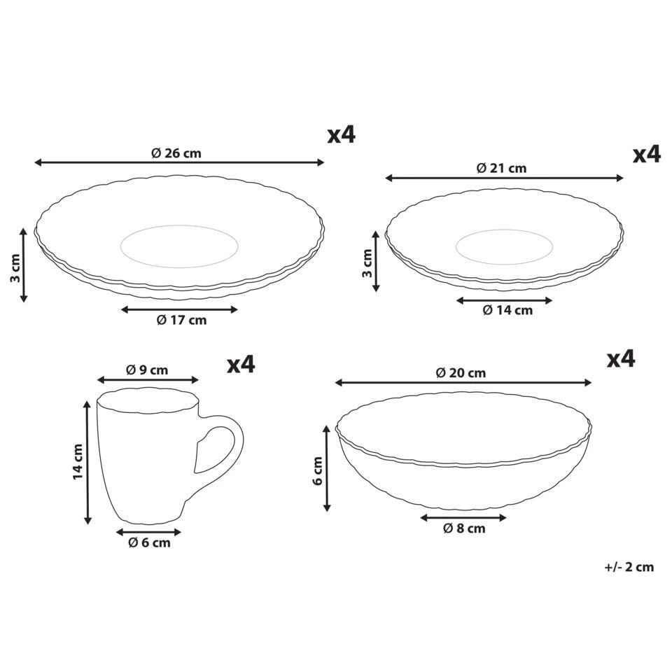 Aanbod omvat: 4 x Dinerbord, 4 x Dessertbord, 4 x Mok, 4 x Diepe borden