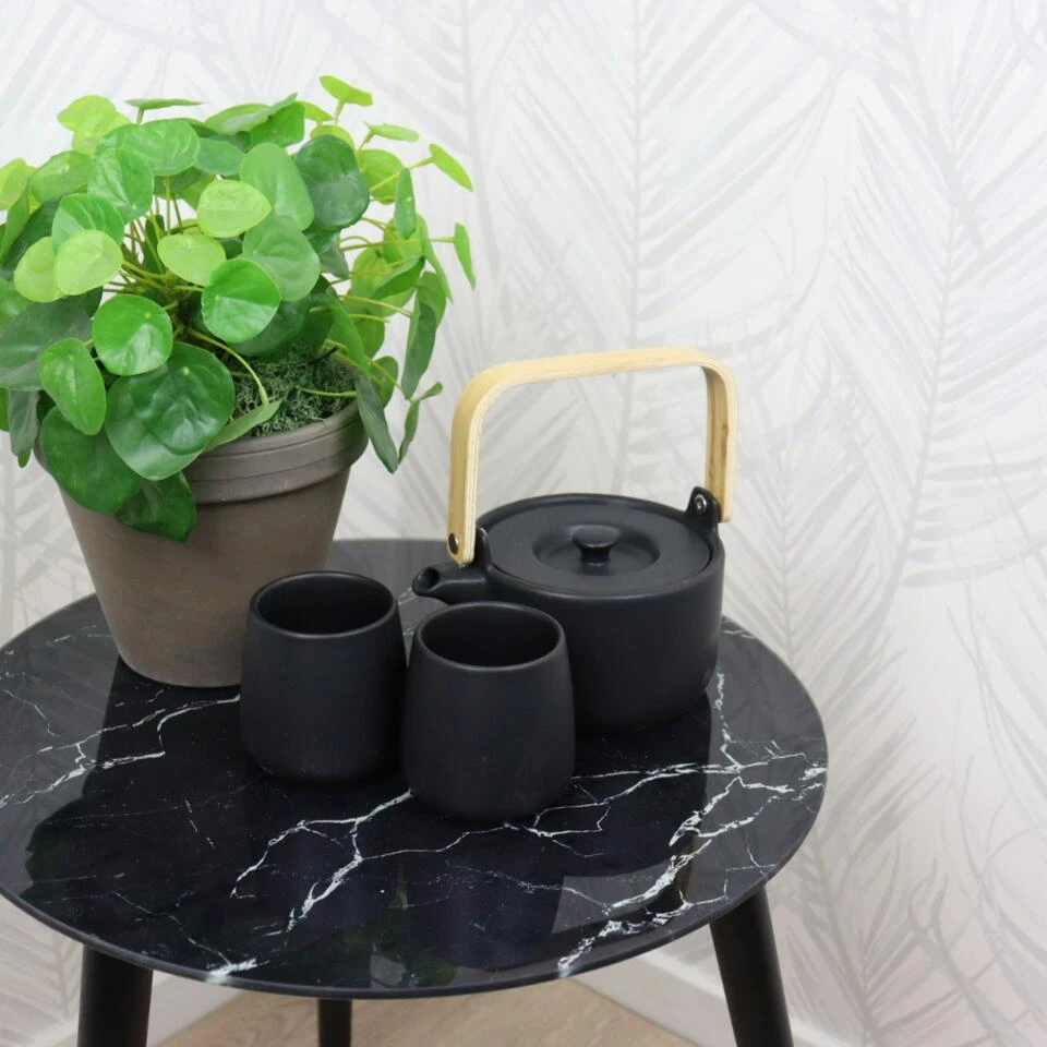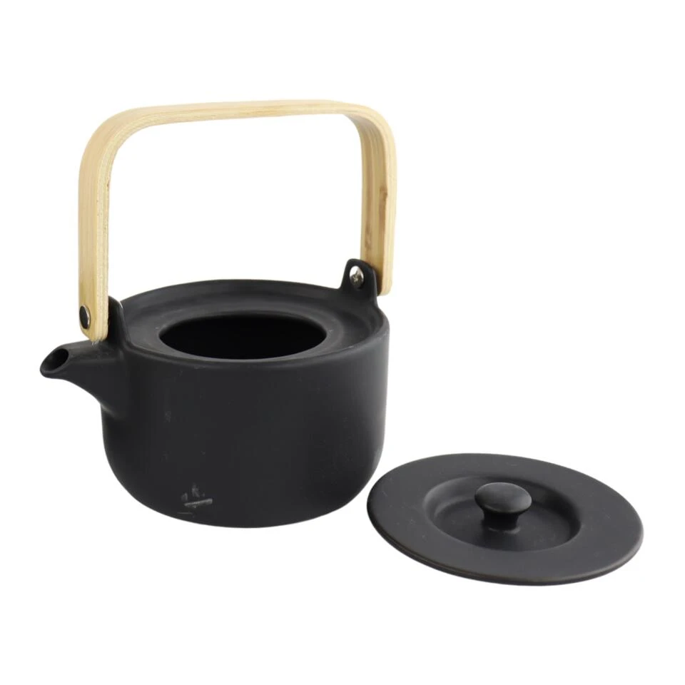 Deze Orange85 theepot zwart 50cl staat mooi op iedere tafel. De theepot is gemaakt van aardewerk. Dit materiaal houdt de warmte goed vast waardoor de thee lang lekker blijft. Het handvat is gemaakt van bamboe wat niet warm wordt. Dit zorgt ervoor dat je de thee op ieder moment kunt inschenken. De inhoud van deze theepot is 50 cl waar je gemiddeld 2.5 kopjes thee uit kunt halen. De theepot wordt geleverd met twee kopjes in dezelfde kleur. De inhoud van de kopjes is 20 cl. Niet geschikt voor de vaatwasser.