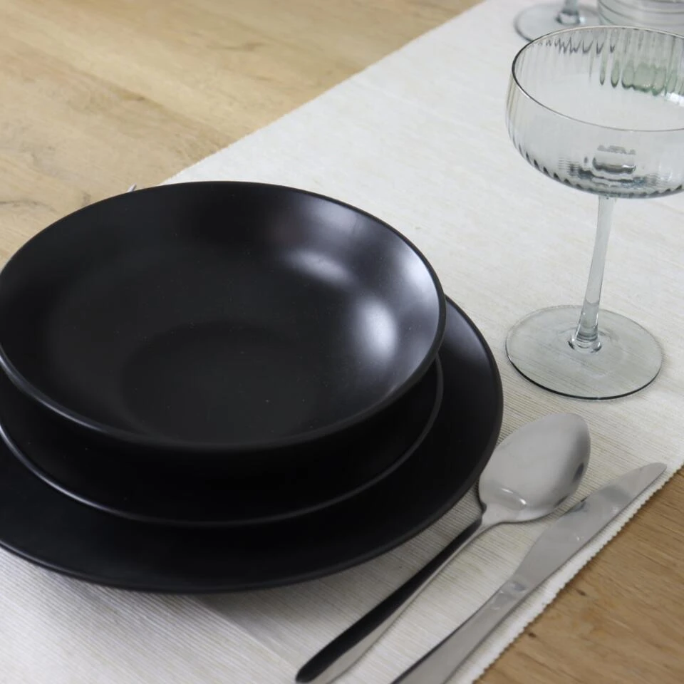 De mat zwarte afwerking zorgt voor een luxe en verfijnde sfeer, terwijl de set vaatwasmachinebestendig is voor eenvoudig onderhoud.