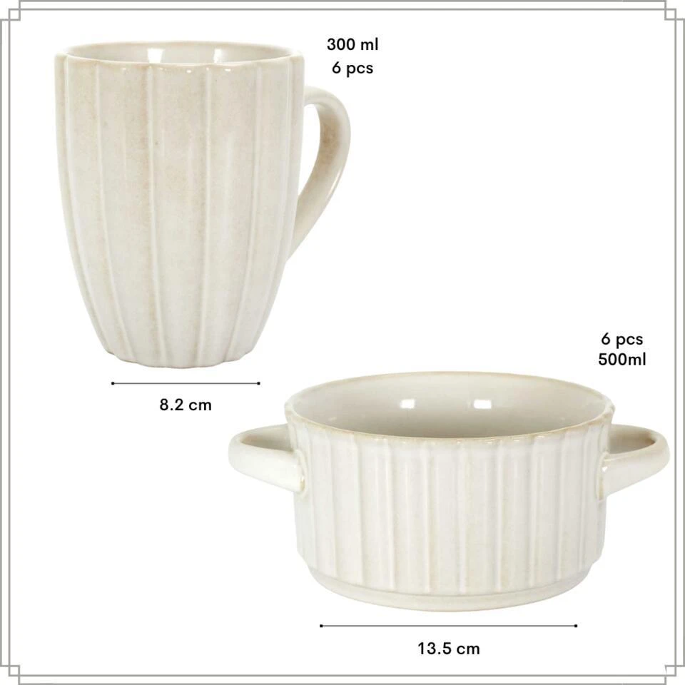 Met deze set ben je goed uitgerust voor het serveren van heerlijke soepen en verschillende koffiesoorten. De stevige en duurzame materialen maken de kopjes en kommen eenvoudig te reinigen en ideaal voor dagelijks gebruik.